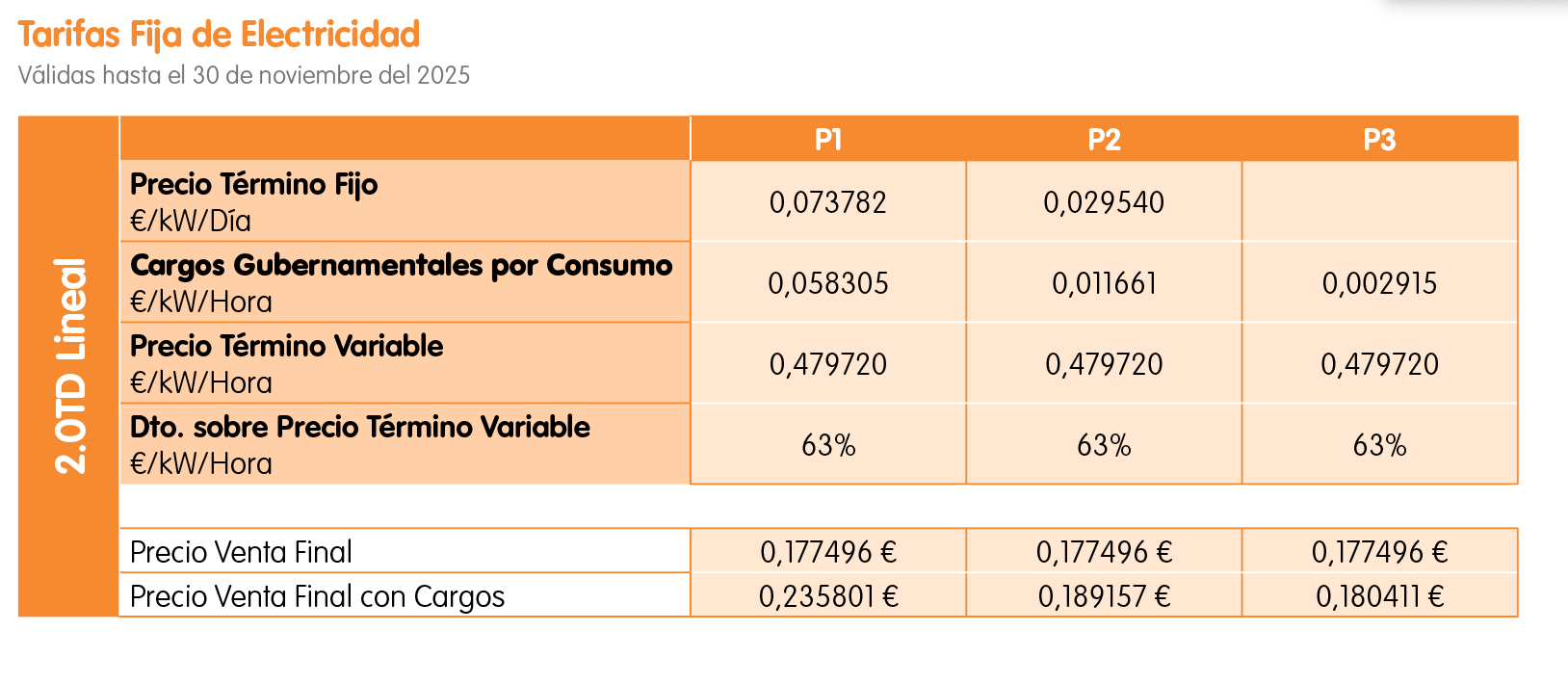 Condiciones de la Tarifa Fija Luz 2.0TD Lineal